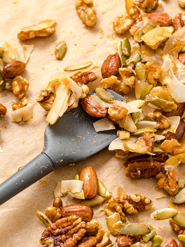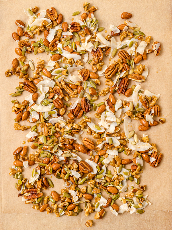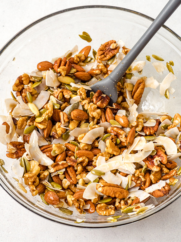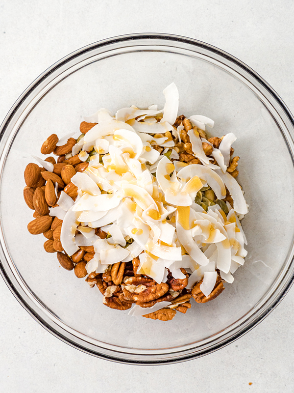 Making this recipe couldn’t be simpler. Combine the nuts, pumpkin seeds, and coconut chips in a large mixing bowl. Drizzle the maple syrup in and mix thoroughly to combine.