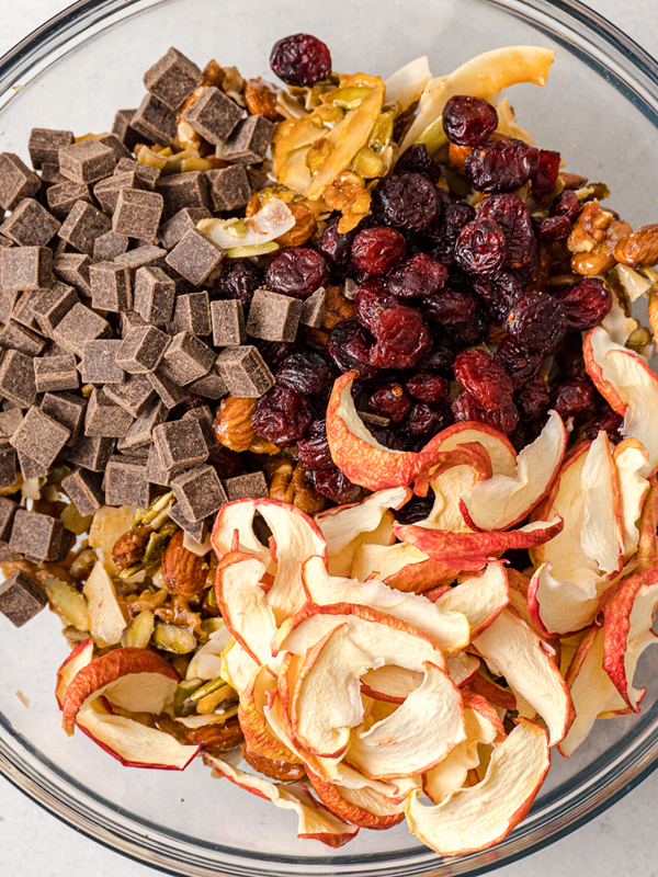 Break apart the trail mix and transfer to a clean bowl. Add the chocolate chips, dried cranberries, and dried apples.