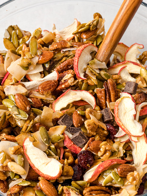 The perfect snack to take with you on the trail, to work, or back to school. This Apple Maple Trail Mix is a great way to embrace the fall season. It features seasonal ingredients like dehydrated apples and pumpkin seeds, along with a few perennial favorites like nuts, cranberries, and chocolate chunks. But the best part is the maple syrup glaze. It gives the trail mix just the right amount of crunch and sweetness. It’s a great grab-and-go snack for your autumn adventures.