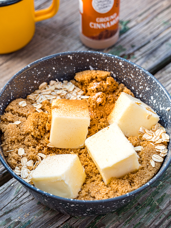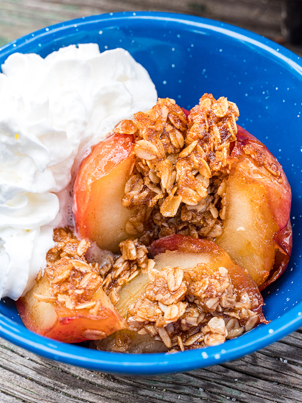 The warm and soft apple pairs perfectly with the caramelized brown sugar and buttery oats! Top all of that with a shot of whipped cream and it’s got all the makings of a classic camping dessert.
