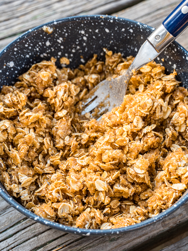- While the fire or charcoal is getting ready, make the filling for the apples. In a small bowl, mix together the oats, brown sugar, softened butter, butter, and salt.