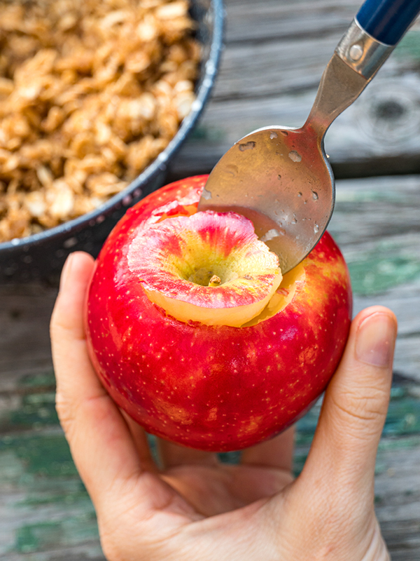 - Carve out the middle of the apples using a small spoon. Start from the top of the apple and carve your way down into the core, removing the core and all the seeds. The most important thing here is to not carve through to the bottom! (Otherwise, all the butter and brown sugar will drip out, leaving the filling dry and your Dutch oven a sticky mess.)