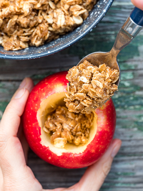 - Fill the apples with the oats and sugar mixture and pack it down with your spoon.