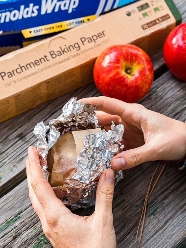 - Foil Method: Tear off a square of aluminum foil and place your apple in the center. Lift the corners towards the center and wrap together. You want the seam at the top and full coverage on the bottom. Using a pair of long-handled tongs, place the individually foil-wrapped apples, top up, to a bed of charcoal or embers.