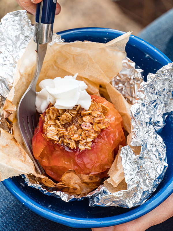 Soft apples, brown sugar, oats, and butter—campfire baked apples are one of our favorite dessert memories from camp when we were kids.