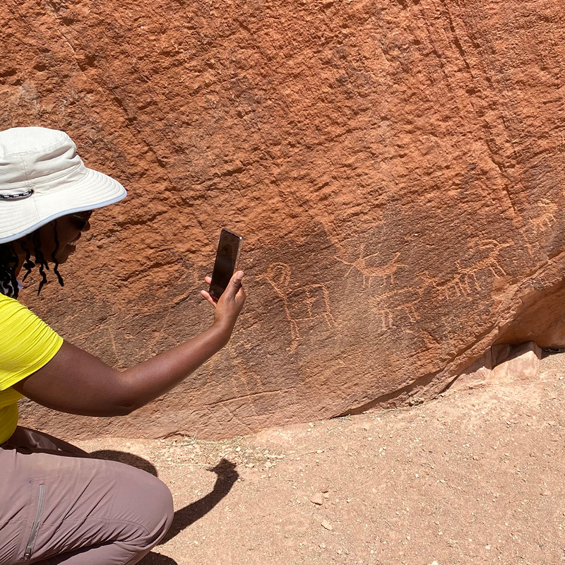 The first couple of miles were open desert with a good trail wandering through tall sagebrush and in and out of the dry, sandy wash. Temperatures were in the high 60’s to low 70’s with a pleasant breeze. Our overnight packs, mine the Alchemist 35/45 and Nailah’s the Alpine Sisu 50 were roughly 35-40 lbs. each. Carrying 2+ liters of water added to the weight, considering we wouldn’t have any water source until we reached camp in Horse Creek. The only signs and remnants of the Ancient Ones who inhabited these lands thousands of years ago were petroglyphs on large boulders at the mouth of the canyon. Perhaps the extreme landscape,floods and drought made this difficult to inhabit or perhaps the petroglyphs indicate that this area was abundant with good hunting.
