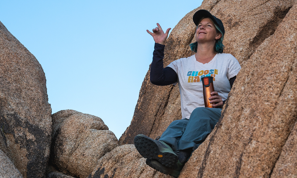 In 2012, Sonya founded the ASL Climbing Network, a community of ASL climbers around the world. Now based in Los Angeles, Sonya organizes monthly meet-ups in the gym, at the local crag, and at Joshua Tree National Park for her Deaf and Hard-of-Hearing climbing community. Friends, old and new, connect and talk about the latest problems they’re encountering on and off the wall. She has spent years advocating for the sport to bridge the gap and make climbing and spending time outside more accessible for her community.