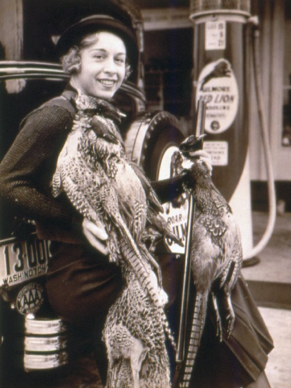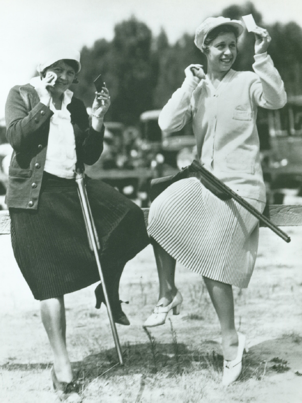 Center: Seattle Gun Club, ca 1930: Stine (right) and friend vamp for the camera as they wait to compete at a shoot.