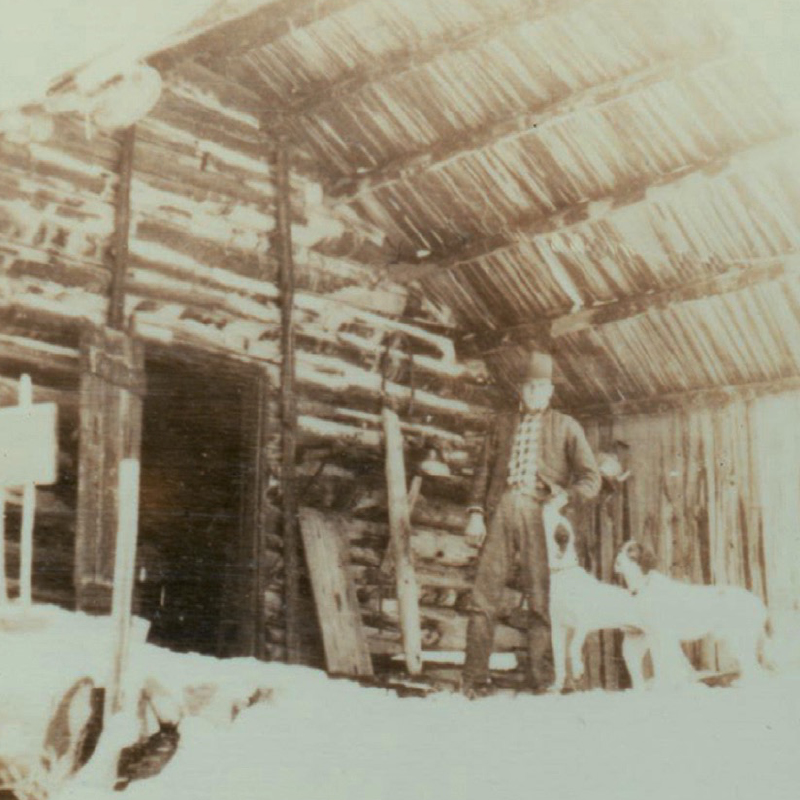 Right: Bodie Mountain, 1927: John Jilg with Silver and Red at the abandoned Rusk cabin.