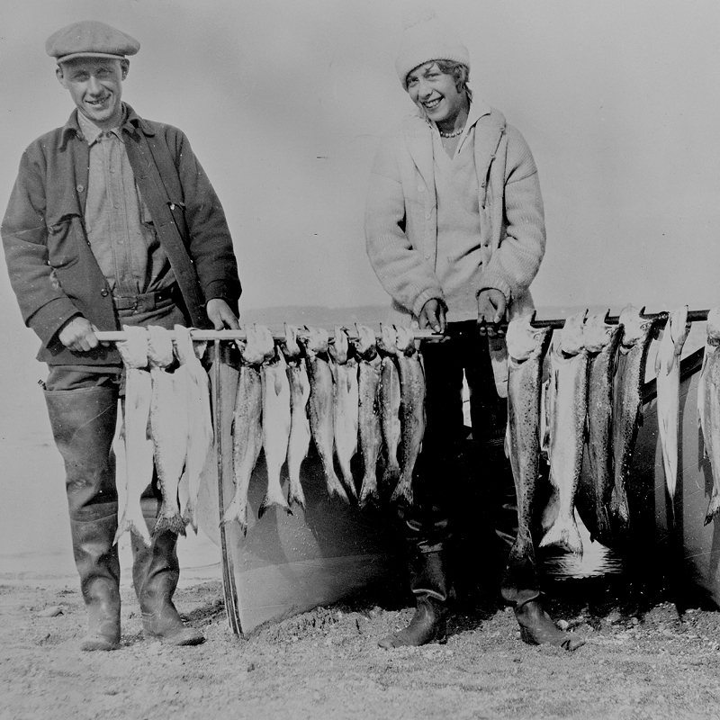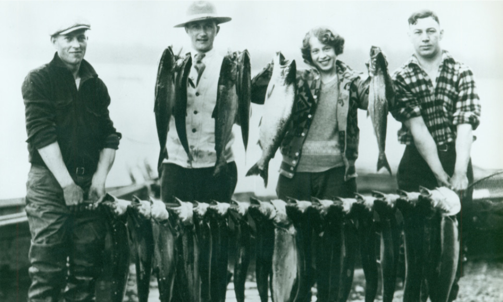 Clockwise: June 17, 1928: Bill Lindberg and Stine Heltborg display a catch for a full-page article in The Seattle Daily Times about salmon spinning. | Baby Island, 1928: Stine on a fishing date with Eddie and lifelong friends John and Blanch Jilg. | Steamboat Island, 1928: Emil Johnson, Eddie, Stine, and Gatch Coho pose for the Hollywood film crew producing a newsreel on salmon spinning.